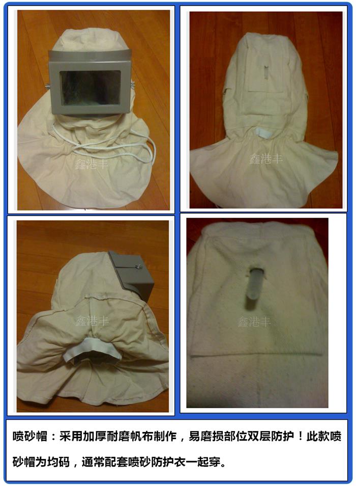 2、此款喷砂帽后方进气孔采用双层设计,内有一层涂胶布,可以更好的保护作业人员面部皮肤,防止进气口直吹头部,并引导气体吹到玻璃面罩处,供人工呼吸的同时可以有效防止玻璃起雾。衣服内部全部都有锁边处理,防止帽子里面全是棉线、灰尘,可以提供给作业人员一个非常干净、舒适的头部环境。