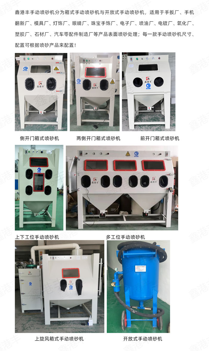 喷砂机作为一种表面处理设备,从功能及操作方式上可以作更细的分类,以我们鑫港丰的喷砂机为例,通常喷砂机分为干式喷砂机和湿式喷砂机.干式喷砂机与湿式喷砂机又可以分为自动喷砂机与手动喷砂机,从喷产品的类型来分,自动喷砂机又可以分为输送式自动喷砂机,转盘式自动喷砂机,小零件滚喷式自动喷砂机,带推车导入式自动喷砂机,内外壁自动喷砂机以及其他非标定制类的喷砂机,手动喷砂机又可分为箱体式喷砂机,开放式喷砂机,从气压喷砂原理来分,可分为压送式喷砂机与吸入式喷砂机,下面我们用部分图给大家介绍下从喷产品的类型分类用途,让大家看的更清晰更直观。选择什么样的喷砂机设备,用户可以结合下面的介绍来合理选择。如果需要专业人士协助处理的,可以与我们联系http://www.szgfjx.com/index.html。![]() ![]() ![]() ![]() ![]() |