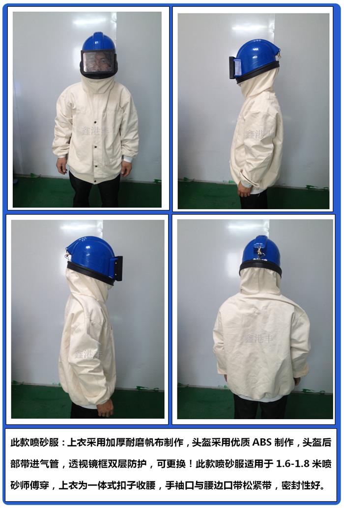 1、轻便,结实,质量可靠的头盔式喷砂服!它符合国家的安全技术质量标准。这种头盔功能齐全,可以有效减少疲劳和停机时间,提高生产效率和减少需要更换的部件。