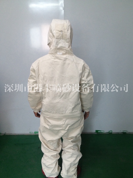 2、此款喷砂服后方进气孔采用双层设计,内有一层涂胶布,可以更好的保护作业人员面部皮肤,防止进气口直吹头部,并引导气体吹到玻璃面罩处,供人工呼吸的同时可以有效防止玻璃起雾。衣服内部全部都有锁边处理,防止帽子里面全是棉线、灰尘,可以提供给作业人员一个非常干净、舒适的头部环境。